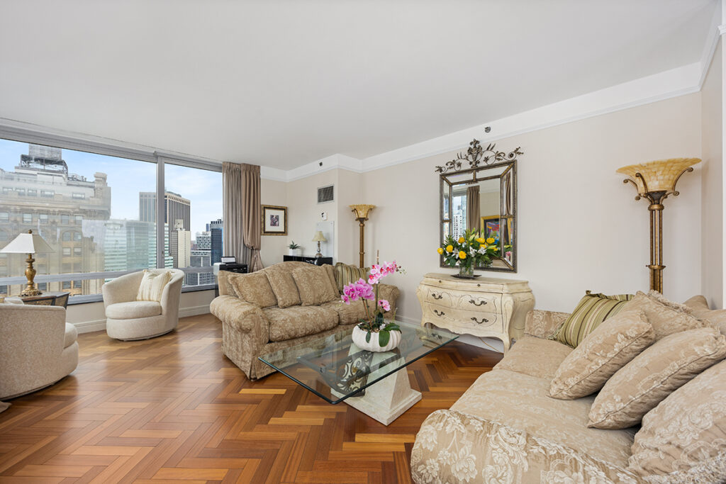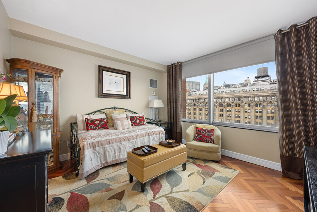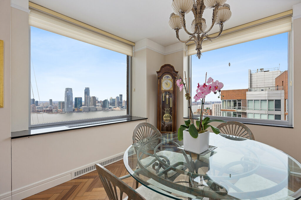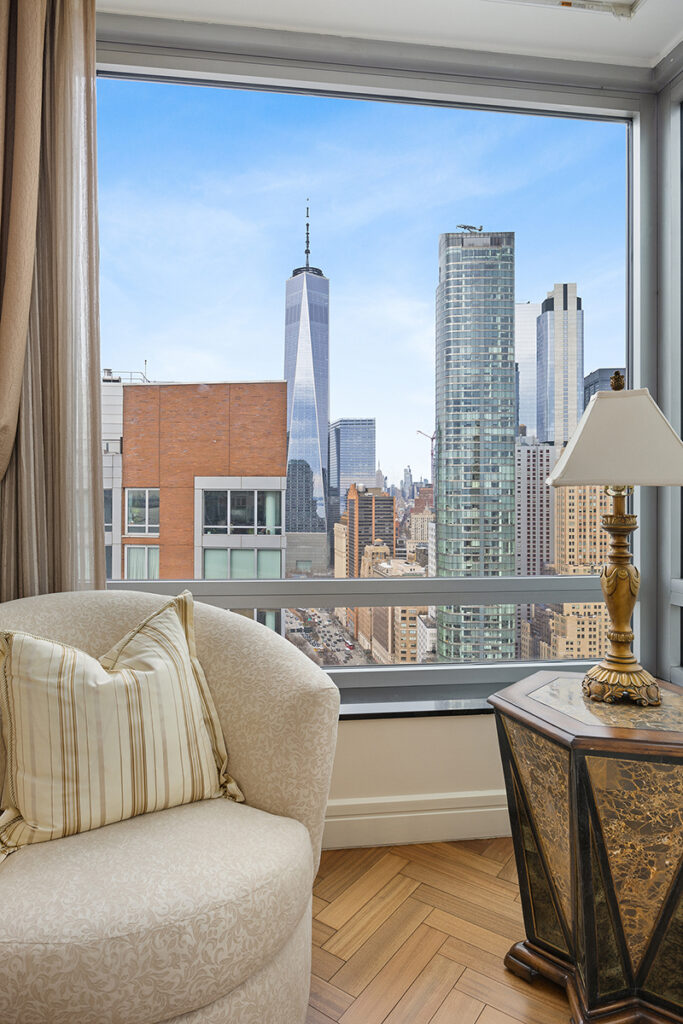 客厅可欣赏哈德逊河及纽约港景观,卧室可看到曼哈顿天际线,包括世贸中心及帝国大厦。