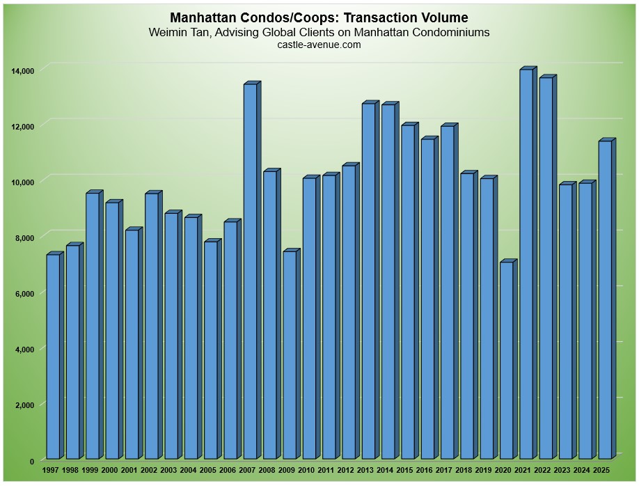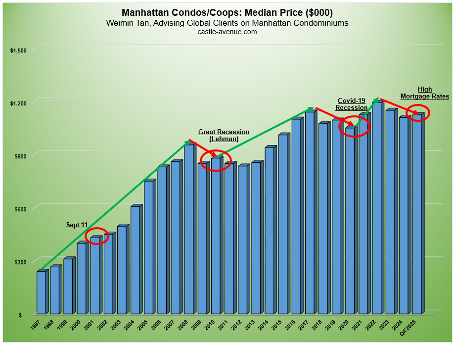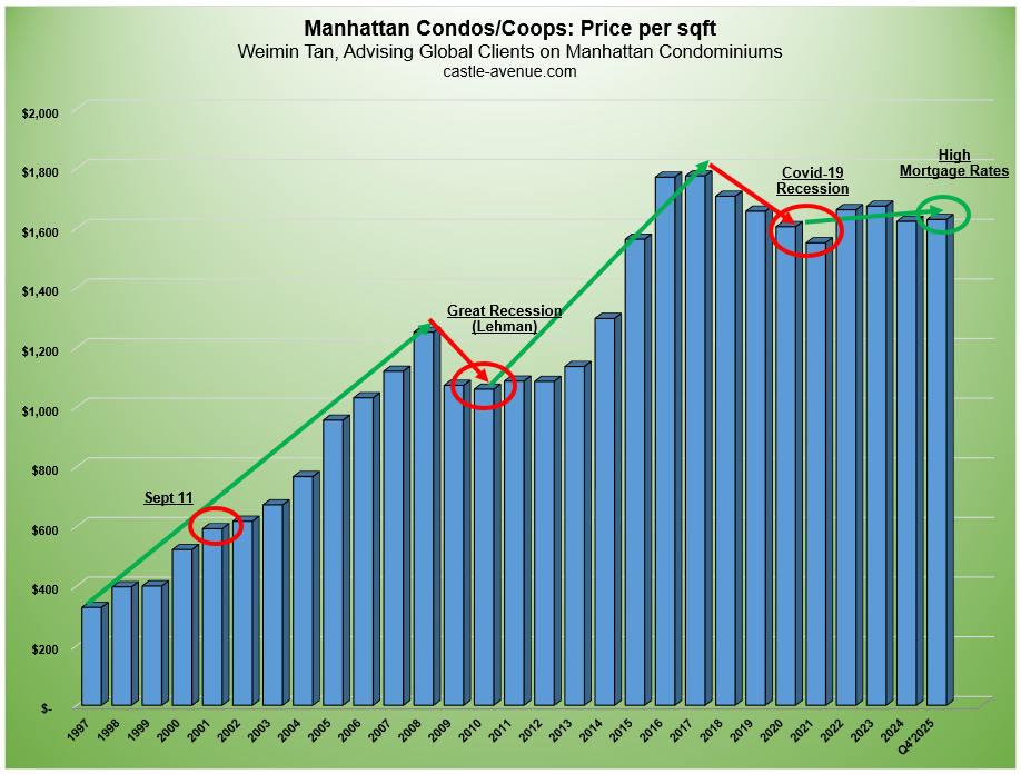 Graph above shows the historical median price of a Manhattan condo/coop increasing from $239,000 in 1997 to $1.12 million in Q4’2025. While the graph shows the blended average of condo/coop, the median price of a Manhattan condo in Q4’2025 was $1.661 million.