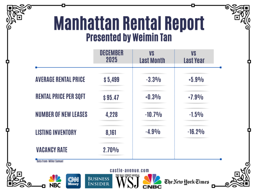 Rental expense is about 30 percent of the inflation index. With inflation that peaked at 9 percent about 2 years ago, rents commensurately increased. Further, there is added demand from buyers who became renters as a result of high mortgage rates. In December 2025, average rent was at $5,499 while vacancy rate was 2.7 percent.